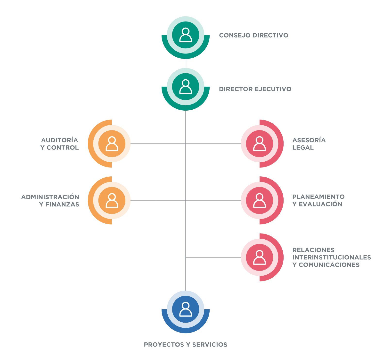 Está presidida por un Consejo Directivo, como autoridad máxima de las decisiones institucionales, y conformada por la Dirección Ejecutiva; un órgano de línea: Proyectos y Servicios; tres órganos de asesoramiento: Asesoría Legal, Planeamiento y Evaluación, y Relaciones Interinstitucionales y Comunicaciones; dos órganos de apoyo: Administración y Finanzas, y Auditoría y Control.