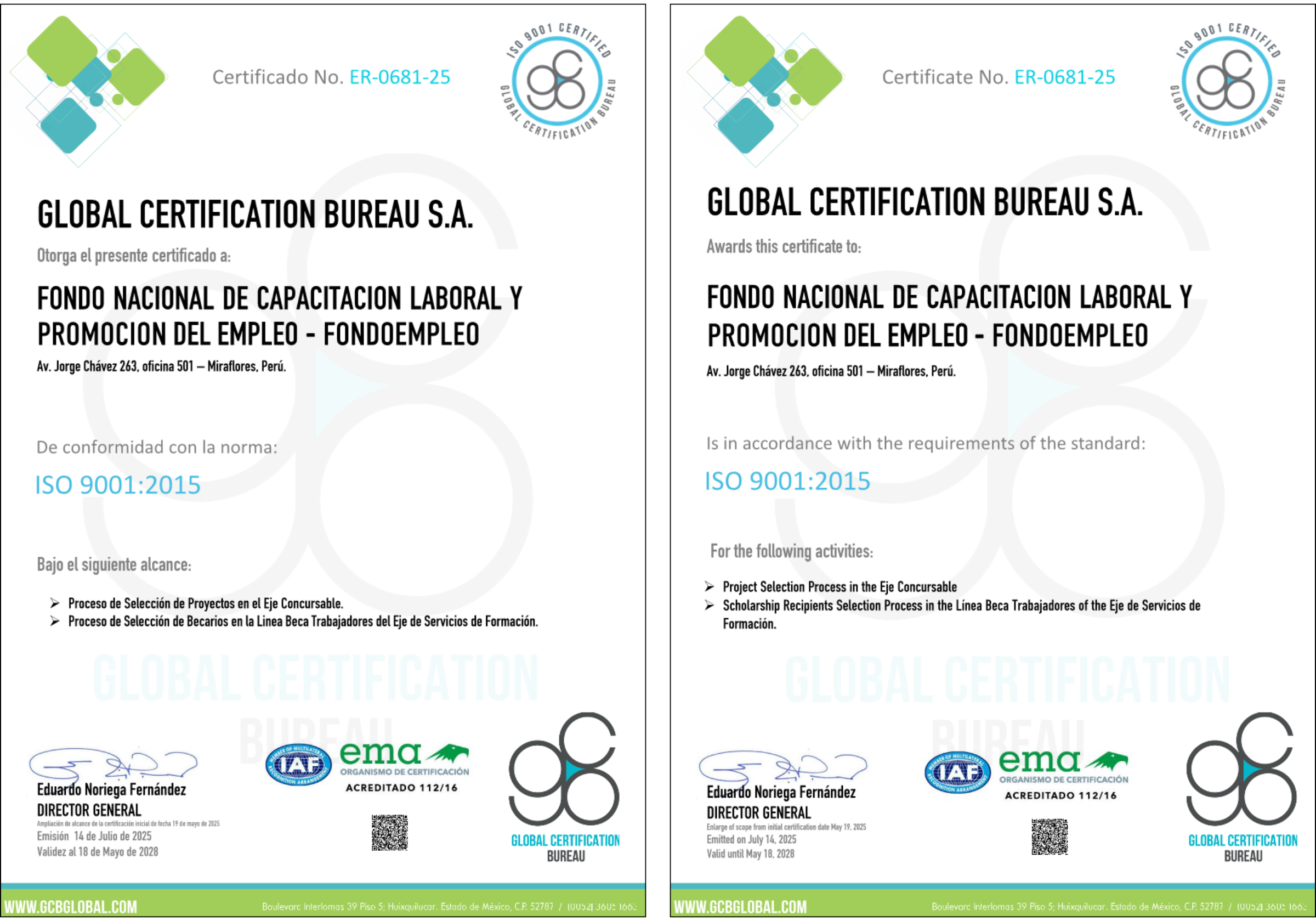 En FONDOEMPLEO, la calidad, la eficiencia y la mejora continua son los pilares de todo lo que hacemos. Para asegurarnos que nuestros servicios y operaciones cumplen con los más altos estándares a nivel nacional e internacional, nos sometemos a rigurosas evaluaciones por parte de organismos certificadores de prestigio.